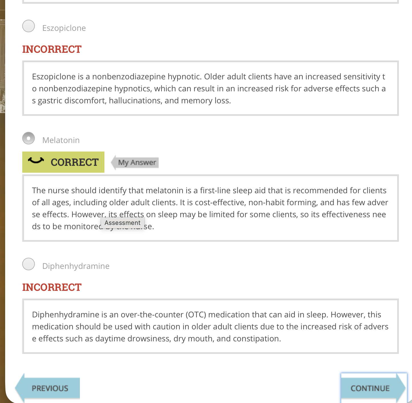A nurse is caring for an older adult client who is having difficulty sleeping and has a new prescription for a medication to help them sleep. Which of the following medications should the nurse identify as a first-line sleep ai d for older adults?