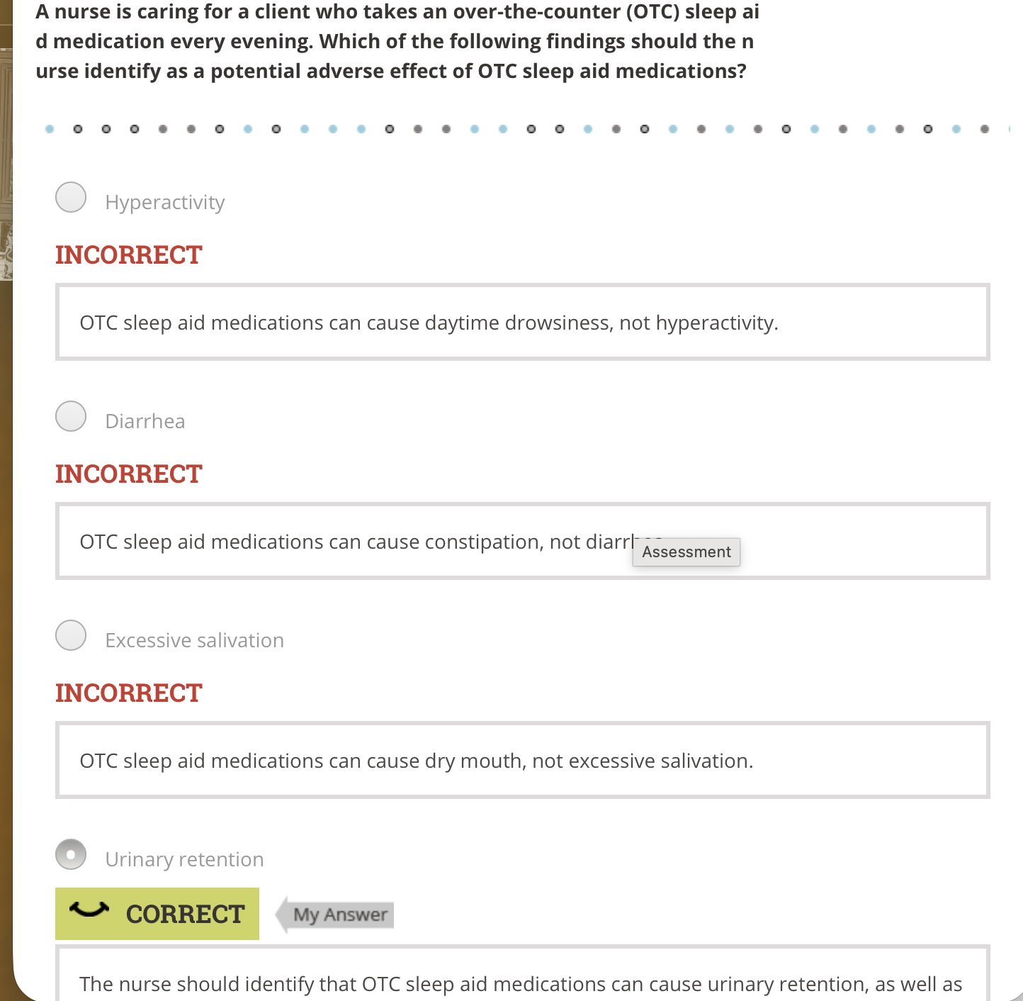 A nurse is caring for a client who takes an over-the-counter (OTC) sleep ai d medication every evening. Which of the following findings should the n urse identify as a potential adverse effect of OTC sleep aid medications?