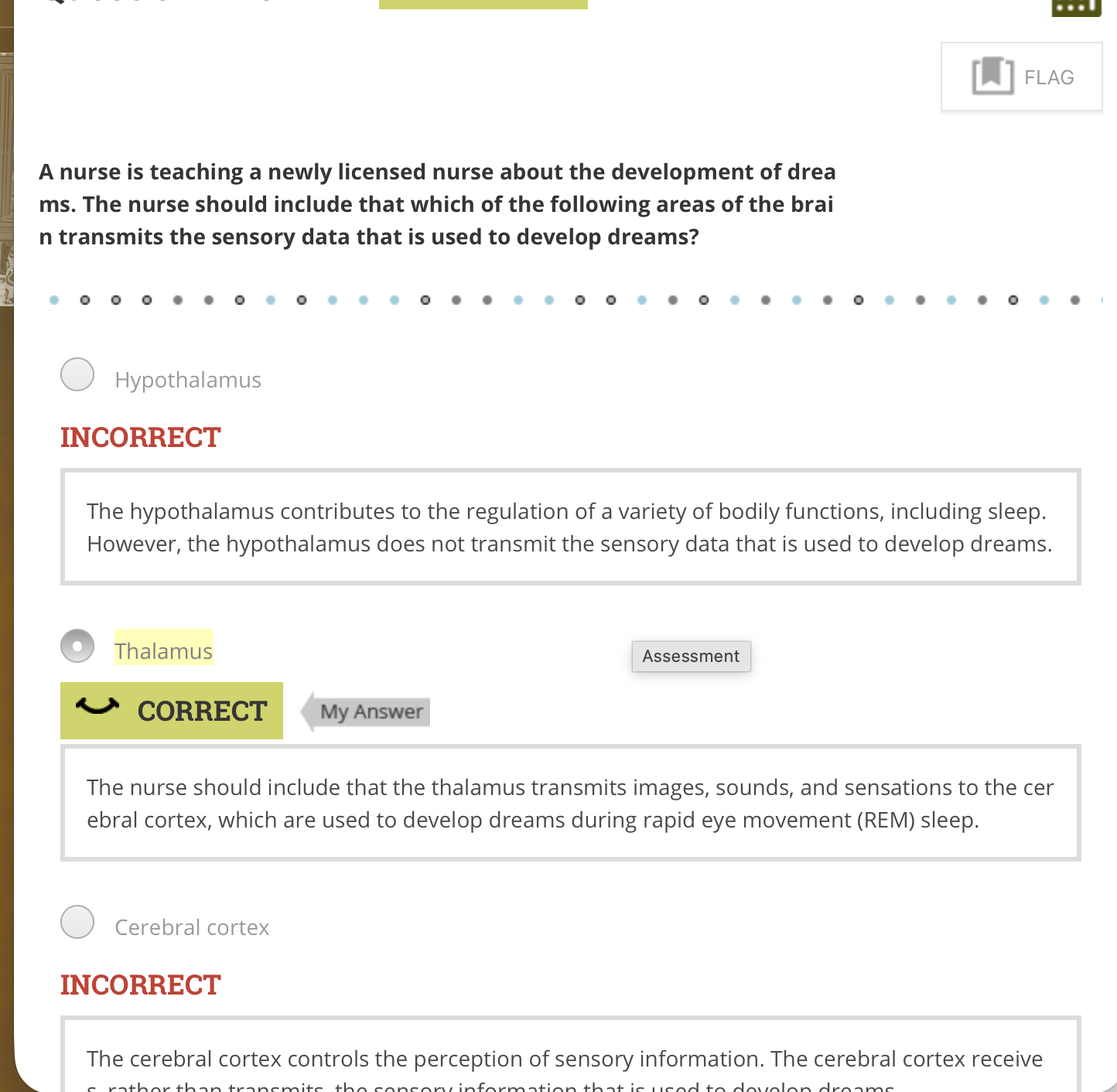 A nurse is teaching a newly licensed nurse about the development of drea ms. The nurse should include that which of the following areas of the brai n transmits the sensory data that is used to develop dreams?