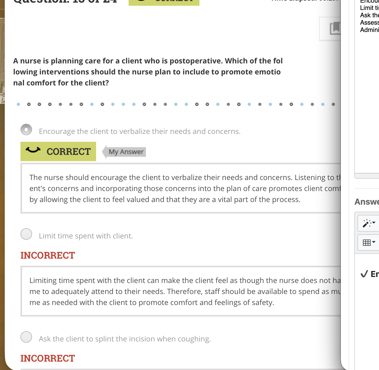 A nurse is planning care for a client who is postoperative. Which of the fol lowing interventions should the nurse plan to include to promote emotio nal comfort for the client?