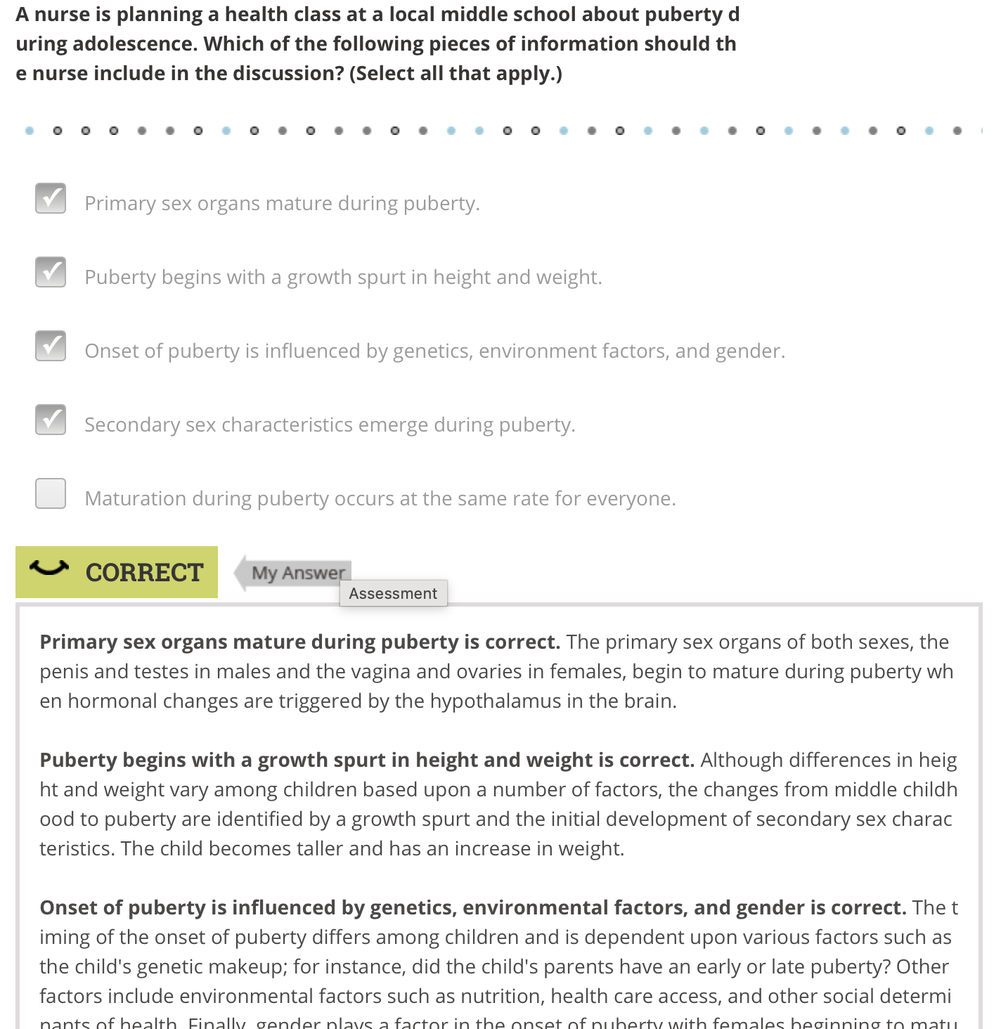 A nurse is planning a health class at a local middle school about puberty d uring adolescence. Which of the following pieces of information should th e nurse include in the discussion? (Select all that apply.)