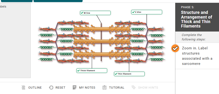Structure and arrangement of thick and thin filaments. Zoom in. Label structures associated with a sarcomere