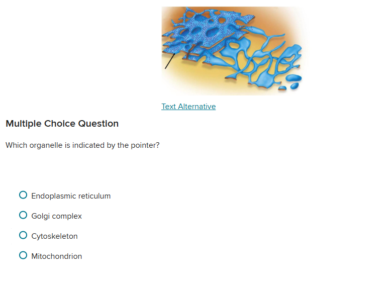 Which organelle is indicated by the pointer? Endoplasmic reticulum Golgi complex Cytoskeleton Mitochondrion Answer: Endoplasmic reticulum....